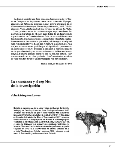- Estudioso excepcional de la vida y obra de Samuel Taylor Coleridge y de Geoffrey Chaucer, John Livingston Lowes (1867-1945) no sólo escribió un par de obras notables en la historia literaria: Convention and Revolt in Poetry (1919) y The Road to Xanadu. A Study in the Ways of Imagination (1927), sino que además durante la mayor parte de su vida se las arregló para combinar la enseñanza con la investigación, en un tiempo en el que esta última se veía al margen de cualquier actividad relevante. Éste es el texto de la conferencia que Lowes impartió en junio de 1932 en la Universidad de Brown. Tomado de la revista The American Scholar, enero de 1933, volumen II, número 1.