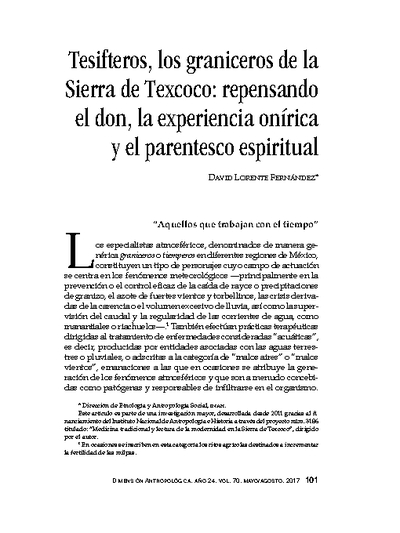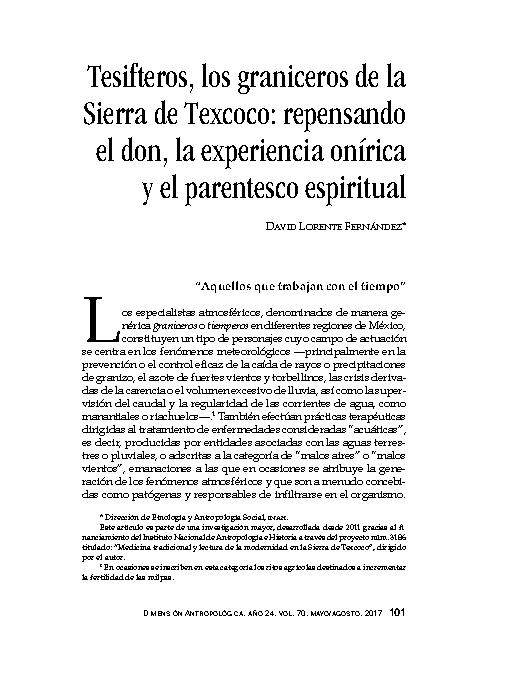 - Using ethnographic information collected in the Nahua Sierra de Texcoco, this article offers a panorama of local weather specialists, known as graniceros or tesifteros. It offers a series of ethnological questions about the significance of recruitment, initiation, the oneiric world, and ritual kinship in the conceptualization of the “spiritual gift”. It also reflects on the learning of the perspective of the spirits regarded as the owners of water by the granicero and on the primacy of ritual commensality in intercession processes. New points of analysis posit —examining native ideas and depictions and also aspects regarding ontological regimens— different, rarely considered approaches in the study of these weather specialists, that perhaps could beextended to the study of different kinds of ritual specialists in Mesoamerica.