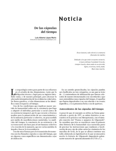 - Arqueología Mexicana 2007 Se localiza una caja de dedicación bajo la estatua de Louis Pasteur. Arqueología Mexicana (84): 12. CBS New York 2014 Opening Of NYC Time Capsule Brings 1914 Into The Present. CBS New York. Recuperado de http://newyork.cbslocal.com/2014/10/08/opening-of-nyc-time-capsule-brings-1914-into-the-present/. [Abren en Nueva York una cápsula del tiempo de 1914]. El Mundo 2009 Cuatro tomos del Quijote de 1819 y otros textos, en la cápsula del tiempo. El Mundo. Recuperado de: www.elmundo.es/elmundo/2009/12/18/madrid/1261136535.html. Jarvis, William E. 2002 Time Capsules. A Cultural History. Jefferson, McFarland and Co. La Vanguardia 2016 Una “cápsula del tiempo” nazi, desenterrada 80 años después de ser ocultada. La Vanguardia. Recuperado de: http://www.lavanguardia.com/vida/20160920/41447691839/capsulatiempo-nazi-polonia.html. National Geographic 2006 Cápsula del tiempo de la Guerra fría encontrada en el Puente de Brooklyn. National Geographic. Recuperado de http://news.nationalgeographic.com/news/2006/03/0324_060324_brooklyn.html. Primer movimiento 2017 Entrevista a Luis Alberto López Wario. Primer Movimiento [programa de radio]. Recuperado de http://www.radiopodcast.unam.mx/podcast/audio/12490. Salas Cuesta, María Elena (coordinadora) 1997 Molino del Rey: historia de un monumento. México, INAH.