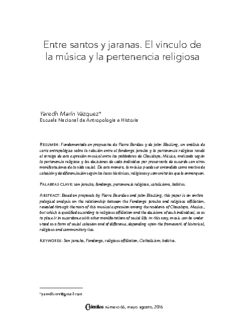 Fundamentado en propuestas de Pierre Bordieu y de John Blacking, un análisis de corte antropológico sobre la relación entre el fandango jarocho y la pertenencia religiosa reveló el arraigo de esta expresión musical entre los pobladores de Chacalapa, México, matizado según la pertenencia religiosa y las decisiones de cada individuo por preservarla de acuerdo con otras manifestaciones de la vida social. De esta manera, la música puede ser entendida como motivo de cohesión y de diferenciación según los lazos históricos, religiosos y comunitarios que la enmarquen.