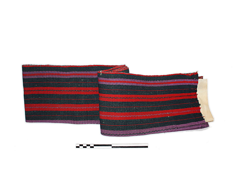 - De forma rectangular formada por tiras horizontales en color azul, rojo y morado.