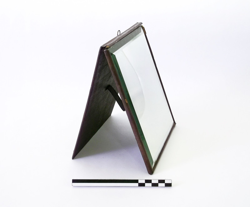 - Espejo cuadrado con funda tipo portafolio que funciona como pedestal en V y marco de madera, los bordes del espejo se encuentran biselados, en la parte posterior presenta una argolla para colgar y una aplicación metálica con las iniciales PDL.