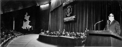 Rafael Galván Maldonado pronuncia discurso durante el Primer Congreso Nacional Extraordinario del Sindicato Único de Trabajadores Electricistas de l ...