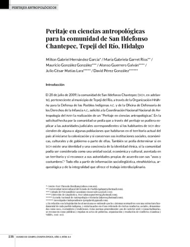 - URL Peritaje en ciencias antropológicas para la comunidad de San Ildefonso Chantepec, Tepeji del Río, Hidalgo. Diario de Campo Cuarta época, año 3, Núm. 8-9 (2019)