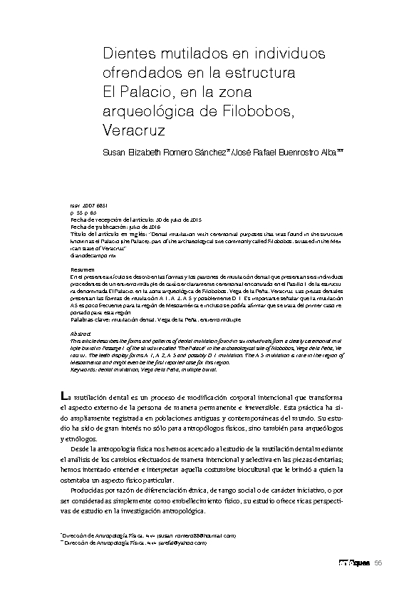 - Serrano Sánchez, Carlos, Martha Pimienta y Alfonso Gallardo Ve-lázquez, “Mutilaciones e incrustaciones dentarias en un entierro colectivo del Templo de Quetzalcóatl, Teotihuacán”, en Estudios de Antropología Biológica, vol. VI, 1997, pp. 293-308.