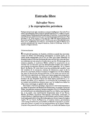 - Testigo excepcional, ágil, sarcástico y siempre inteligente, Salvador Novo ofrece un testimonio único sobre la agitada agenda de la ciudad y el país, cuando Lázaro Cárdenas decidió expropiar el petróleo. A continuación se reproducen las colaboraciones que el cronista entregó al Semanario Hoy los días 5, 12, 19 de marzo y 2 de abril de 1938. En fechas próximas la Dirección de Estudios Históricos del INAH, junto con el Estudio Salvador Novo, A.C., reeditarán sus crónicas, que él tituló La vida en México en el periodo presidencial de, respectivamente, Lázaro Cárdenas, Avila Camacho y Miguel Alemán.