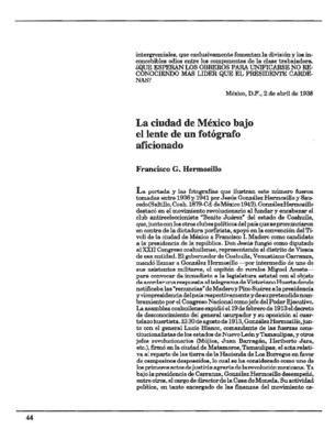 - La portada y las fotografías que ilustran este número fueron tomadas entre 1936 y 1941 por Jesús González Hermosillo y Saucedo (Saltillo, Coah. 1879-Cd. de México 1942). González Hermosillo destacó en el movimiento revolucionario al fundar y encabezar el club antireeleccionista “Benito Juárez” del estado de Coahuila, que, junto con los otros clubes políticos del país que se pronunciaron en contra de la dictadura porfirista, apoyó en la convención del Tívoli de la ciudad de México a Francisco I. Madero como candidato a la presidencia de la república. Don Jesús fungió como diputado al XXII Congreso coahuilense, representando al distrito de Viesca de esa entidad. El gobernador de Coahuila, Venustiano Carranza, mandó llamar a González Hermosillo -por intermedio de uno de sus asistentes militares, el capitán de rurales Miguel Acosta para convocar de inmediato a la legislatura estatal con el objeto de acordar una respuesta al telegrama de Victoriano Huerta donde notificaba las “renuncias” de Madero y Pino Suárez a la presidencia y vicepresidencia del país respectivamente y de su pretendido nombramiento por el Congreso Nacional como jefe del Poder Ejecutivo. La asamblea coahuilense expidió el19 de febrero de 1913 el decreto de desconocimiento del general usurpador y su oposición al cuartelazo huertista. El 30 de agosto de 1913, González Hermosillo, junto con el general Lucio Blanco, comandante de las fuerzas constitucionalistas de los estados de Nuevo León y Tamaulipas, y otros jefes revolucionarios (Mújica, Juan Barragán, Heriberto Jara, etc.), fIrmó en la ciudad de Matamoros, Tamaulipas, el acta relativa al reparto de las tierra de la Hacienda de Los Borregos en favor de campesinos desposeídos, 10 cual se ha considerado como uno de los primeros actos de justicia agraria de la revolución mexicana. Ya bajo la presidencia de Carranza, González Hermosillo desempeñó, entre otros, el cargo de director de la Casa de Moneda. Su actividad política, en tanto encargado de las fmanzas del movimiento carrancista, lo obligó a trasladarse por varias regiones del país realizando recorridos que impulsarían en él una gran sensibilidad por los paisajes, las ciudades coloniales, los espacios de recreación, la tauromaquia, sin dejar de considerar su gusto por la contemplación de los ángulos tradicionales de la ciudad de México y los contrastes que en ella iba operando la modernidad. Gracias a su afición fotográfica, González Hermosillo legó una colección de transparencias en vidrio, conservadas actualmente por su descendencia familiar, en la que captó varios aspectos de la sociedad mexicana, tanto rural como urbana, durante las postrimerías del régimen cardenista. Las que ahora reproducimos son algunas de ellas, que especialmente se refieren a la ciudad de México.