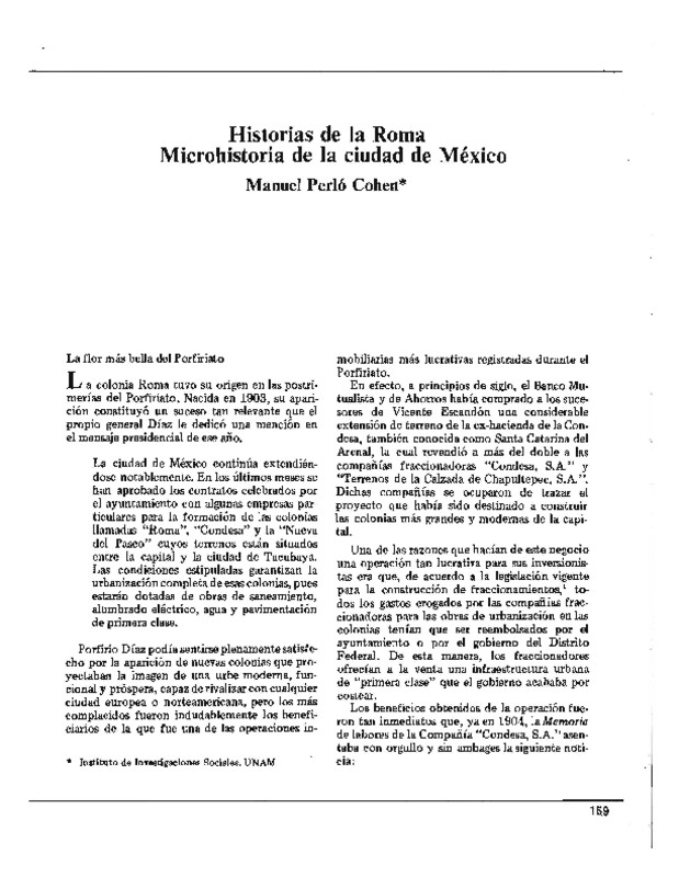 - La colonia Roma tuvo su origen en las postrimerías del Porfiriato. Nacida en 1903, su aparición constituyó un suceso tan relevante que el propio general Díaz le dedicó una mención en el mensaje presidencial de ese año. Porfirio Díaz podía sentirse plenamente satisfecho por la aparición de nuevas colonias que proyectaban la imagen de una urbe moderna, funcional y próspera, capaz de rivalizar con cualquier ciudad europea o norteamericana, pero los más complacidos fueron indudablemente los beneficiarios de la que fue una de las operaciones inmobiliarias más lucrativas registradas durante el Porfiriato.