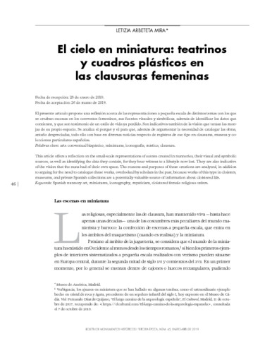 - This article offers a reflection on the small-scale representations of scenes created in nunneries, their visual and symbolic sources, as well as identifying the data they contain, for they bear witness to a lifestyle now lost. They are also indicative of the vision that the nuns had of their own space. The reasons and purposes of these creations are analyzed, in addition to arguing for the need to catalogue these works, overlooked by scholars in the past, because works of this type in cloisters, museums, and private Spanish collections are a potentially valuable source of information about cloistered life.