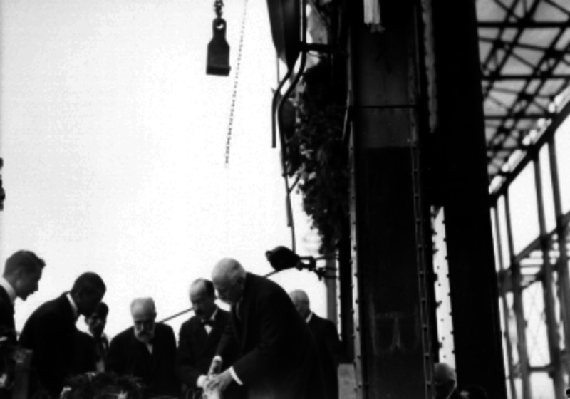 - Esta imagen junto con la 35984 y la 35985 corresponden a la ceremonia de colocación de la primera piedra de lo que iba a ser el Palacio Legislativo (hoy monumento a la Revolución). La acción se desarrolla en la ciudad de México, el 23 de septiembre de 1910, dentro de las festividades por el Centenario de la Independencia de México. Solo una de estas fotografías fue publicada en el diario "El Imparcial", del sábado 24 de septiembre de ese mismo año, por lo cual podríamos colegir que el autor es Agustín Casasola. La secuencia de tres fotografías nos introduce en una suerte de proto-reportaje, en donde el fotógrafo buscaba capturar los diversos momentos de una ceremonia de este tipo. La secuencia va desde la misma búsqueda de la composición, en donde el fotógrafo todavía no encuentra el ángulo preciso, hasta las dos últimas placas en donde se ve a Díaz en posiciones espontáneas, y en donde el fotógrafo captó el momento en que Díaz coloca el cemento en la piedra. Se conocen otras fotografías de la misma ceremonia, en momentos previos, y en donde se observa una gran cantidad de fotógrafos de distintos medios impresos. Información proporcionada por Daniel Escorza. Catálogo de la exposición "El umbral de la lente. Los inicios de Agustín V. Casasola en el fotoperiodismo, 1901-1910". Arturo Valencia. 3/07/07.