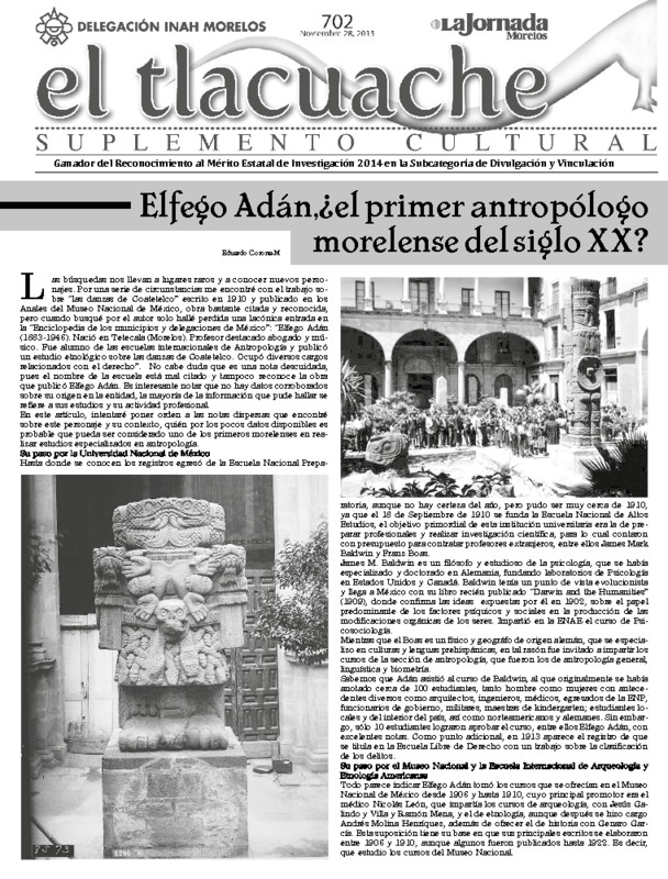 - Elfego Adán, el primer antropólogo morelense del siglo XX? por Eduardo Corona Martínez. - Excursión a Chalma por Elfego Adán.
