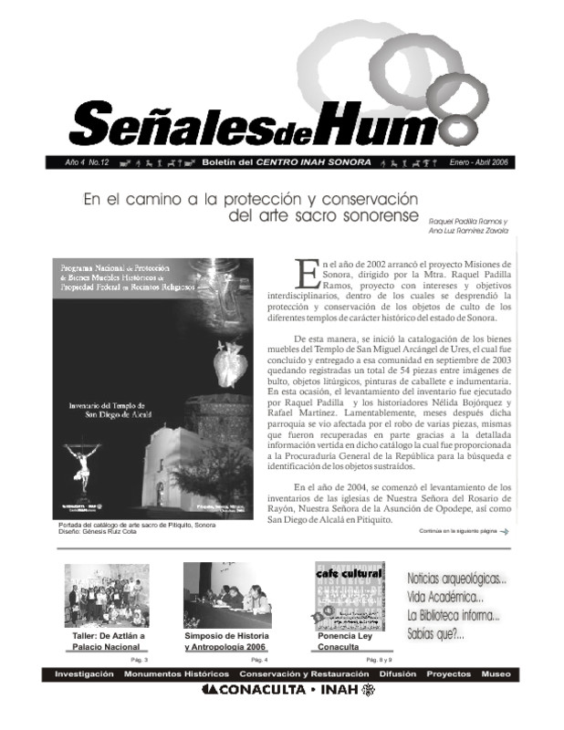 - - En el camino a la protección y conservación del arte sacro sonorense por Raquel Padilla Ramos y Ana Luz Ramírez Zavala. - Editorial por Raúl Andrés Méndez Lugo. - Breve historia de la bandera nacional "De azulan a Palacio Nacional" por Difusión Centro INAH Sonora. - XXXI Simposium de Historia y Antropología de Sonora por Esperanza Donjuan Espinoza. Faristeos, soldados de la fe por Roberto Ramírez Méndez. - De San Miguel de los Tres a Nuestra Señora de la Asunción de Arizpe, fiestas patronales en el Río Sonora por Ana Luz Ramírez Zavala. - Vista a San Diego de Pitiquito por Abby Valenzuela Rivera. - Reflexiones en torno a la iniciativa de Ley de Fomento y Difusión de la Cultura y nuestra materia de trabajo. Extractos de la ponencia elaborada por los trabajadores Técnicos, Administrativos, Manuales, Arquitectos e Investigadores del Centro INAH Sonora, Hermosillo, Sonora, Octubre 31 de 2005. - La biblioteca informa... por Guadalupe Piña Ortiz. - ¿Sabías que... Eréndira Contreras Barragán. - Pérdida importante para la arqueología en Sonora por Cristina García Moreno. - El complejo San Dieguito desde una perspectiva sin fronteras por Cristina García Moreno. - Donaciones al Museo de Sonora por Difusión Centro INAH Sonora.