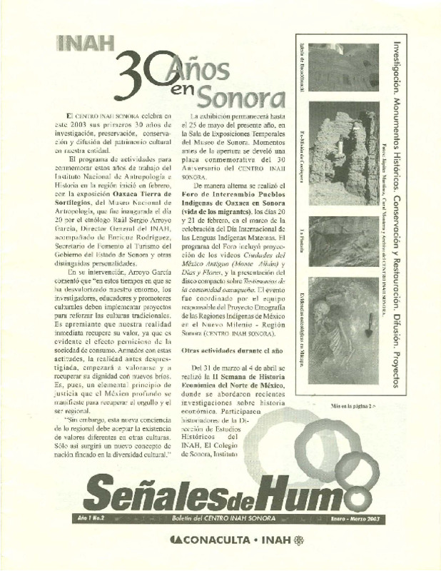 - - INAH 30 años de Sonora por Señales de Humo. - Editorial por Fernando Tapia Grijalva. - Historias de la vieja cárcel por Raquel Padilla Ramos. - En el Museo de Sonora (Antigua Penitenciaría) por Señales de Humo. - II Semana de la Historia Económica del Norte de México por Señales de Humo. - Cocópera Arqueología de una Misión por Júpiter Martínez. - Noticias Arqueológicas por Señales de Humo. - ¿Sabías que... por Eréndira Contreras. - Los yaquis de Hermosillo entre barrios y tradiciones por Alejandro Aguilar Zéleny. - Oaxaca en Sonora por Alejandro Aguilar Zéleny. - La Pintada. Manifestaciones gráfico-rupestre en Sonora por Señales de Humo. - La Biblioteca Ernesto López Yescas informa por Señales de Humo.