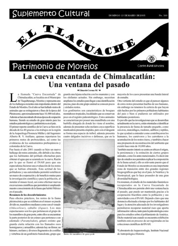 - - La cueva encantada de Chimalacatlán: Una ventana del pasado por Eduardo Corona Martínez. - Mesa Redonda Olmeca: Balances y Perspectivas por Elizabeth Palacios.- El Yauhtli por Margarita Áviles y Macrina Fuentes.